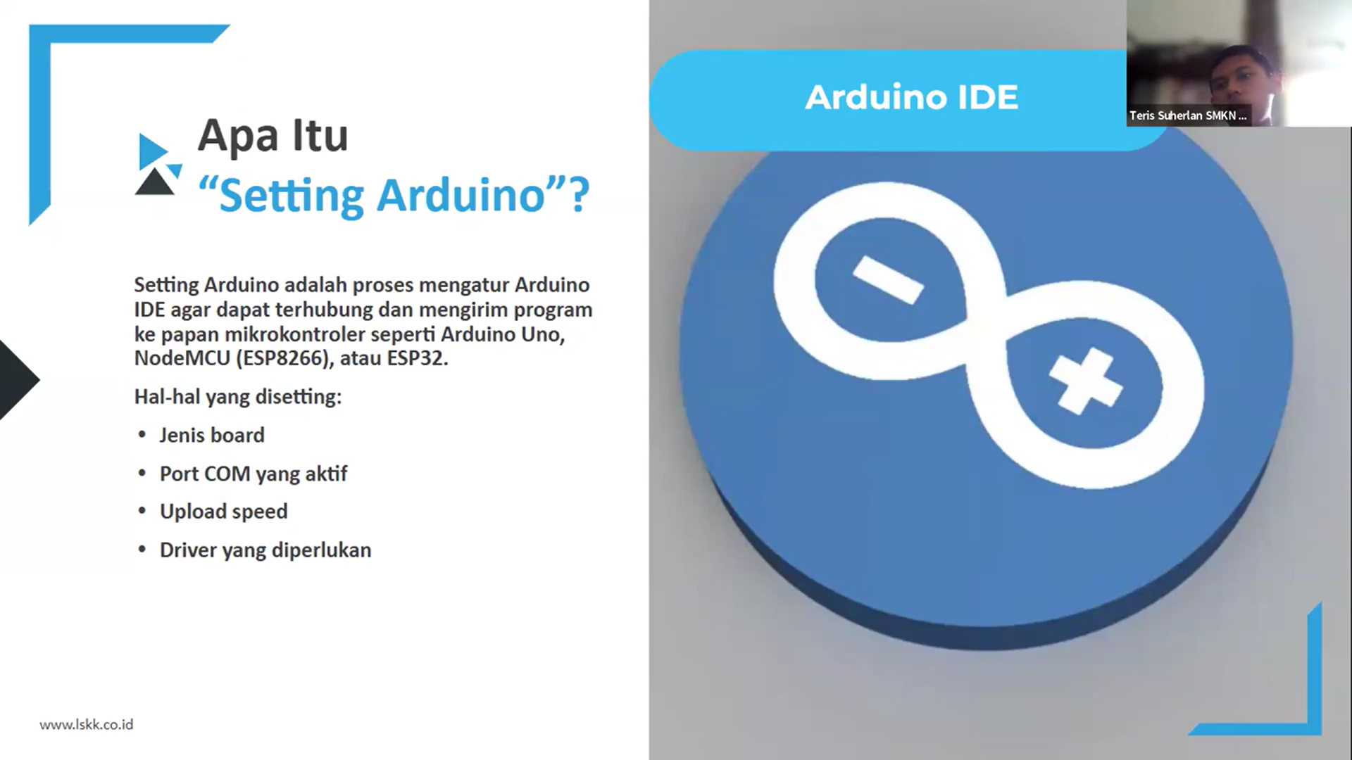 Pada hari Senin, 30 Maret 2026, telah dilaksanakan workshop daring bertajuk “PJBL: Desain Alat Water Tank” melalui Zoom Meeting. Kegiatan yang dipandu oleh Nayla Azka Fatima Soehaya dari SMKN 13 Bandung sebagai host dan notulen ini menghadirkan Teris Suherlan dari SMKN 1 Katapang sebagai pemateri utama. Fokus pembahasan dalam sesi ini adalah mengenali ekosistem Arduino dan langkah-langkah sistematis dalam merancang alat pendeteksi level air (Water Tank).