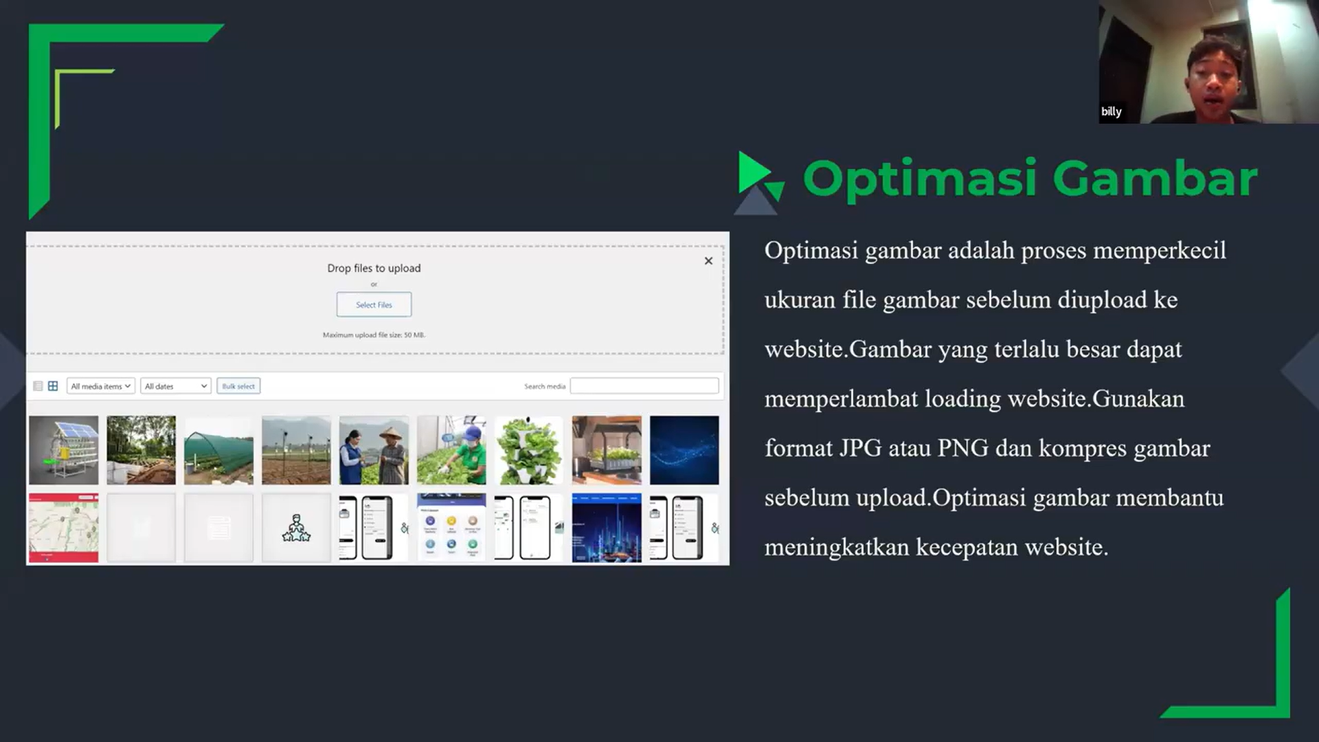 Dalam sesi teknisnya, Billy menjelaskan empat pilar utama optimasi: konfigurasi SEO menggunakan Rank Math atau Yoast SEO, kompresi gambar sebelum diunggah untuk mempercepat loading, pengaturan struktur permalink yang efektif, serta teori dasar pemasangan Google Search Console. Pembahasan ini bertujuan agar peserta mampu mengelola website yang tidak hanya menarik secara visual, tetapi juga optimal secara teknis.