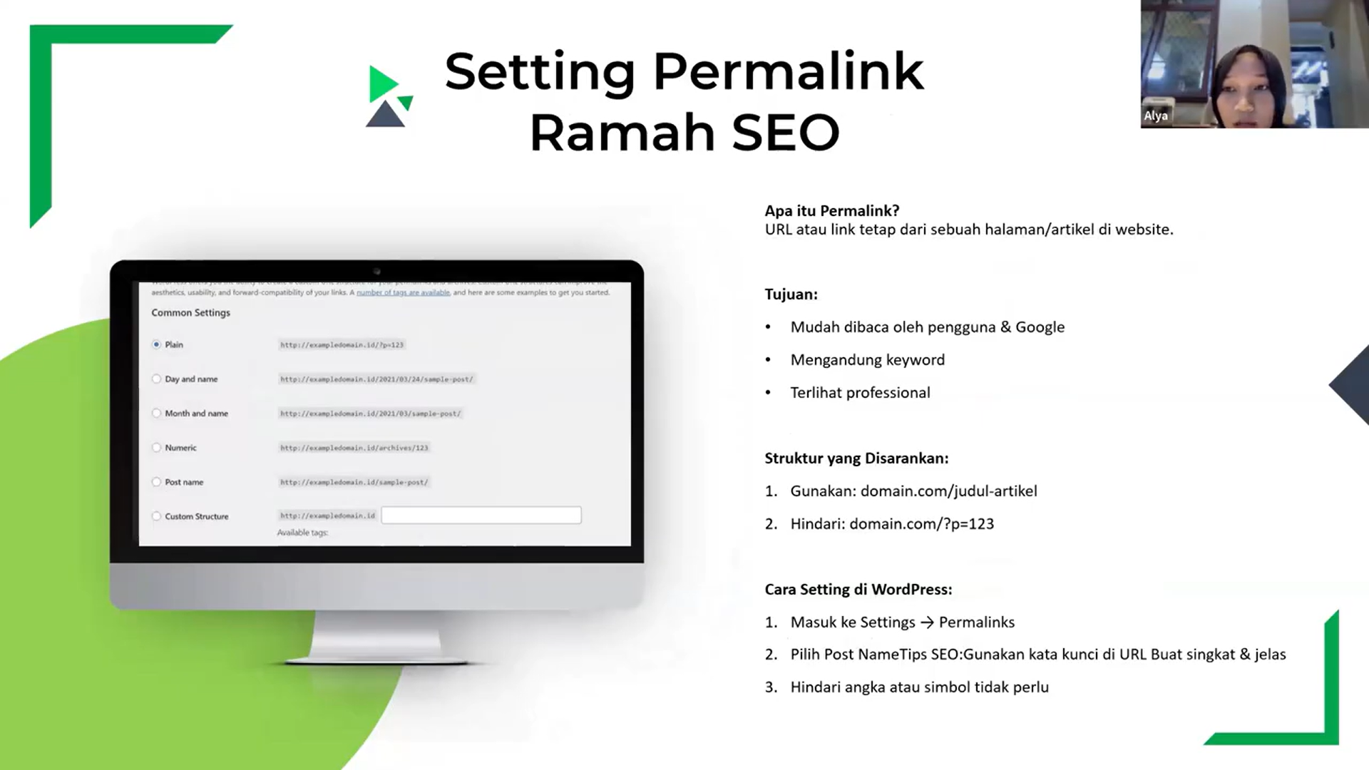 Alya membedah empat materi krusial bagi para pengembang web, meliputi setup SEO dasar menggunakan plugin Rank Math atau Yoast SEO, teknik optimasi gambar melalui kompresi sebelum upload, hingga pengaturan permalink yang ramah mesin pencari. Selain itu, Alya juga memaparkan teori mengenai pentingnya memasang Google Search Console untuk memantau kesehatan situs secara berkala.